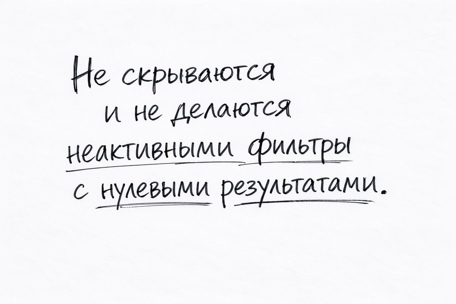 В результате — трата времени и сил. Человек перебирает комбинации, возвращается назад, снимает и снова ставит фильтры. Возникает ощущение, что каталог «сломался» или магазин беден ассортиментом. Доверие падает, мотивация к покупке ослабевает.