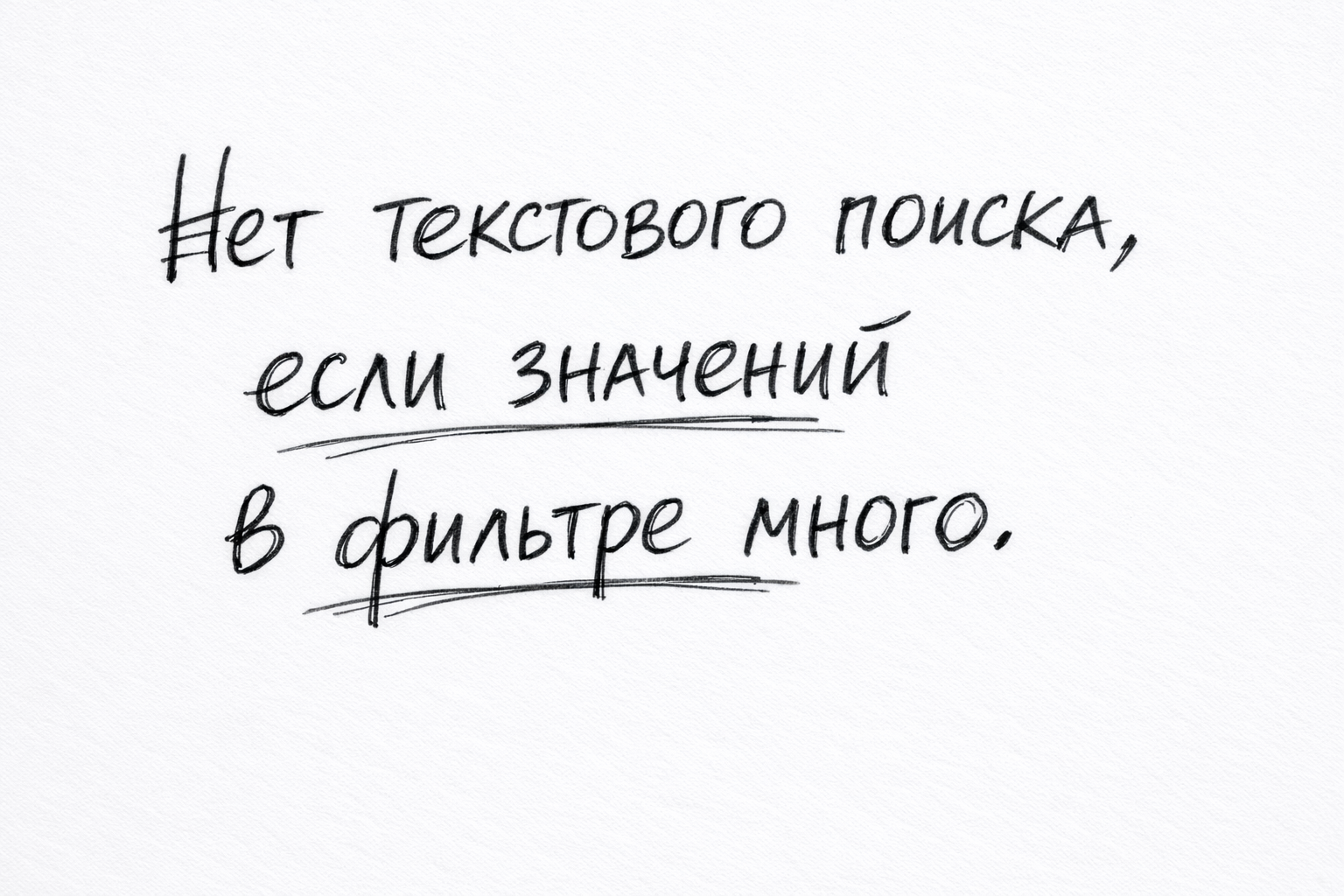 В исследовании каталога выявлена повторяющаяся трудность: когда в фильтрах десятки и сотни значений, отсутствует строка текстового поиска. Пользователь вынужден прокручивать длинные списки, вчитываться в каждую строку и сравнивать похожие формулировки.