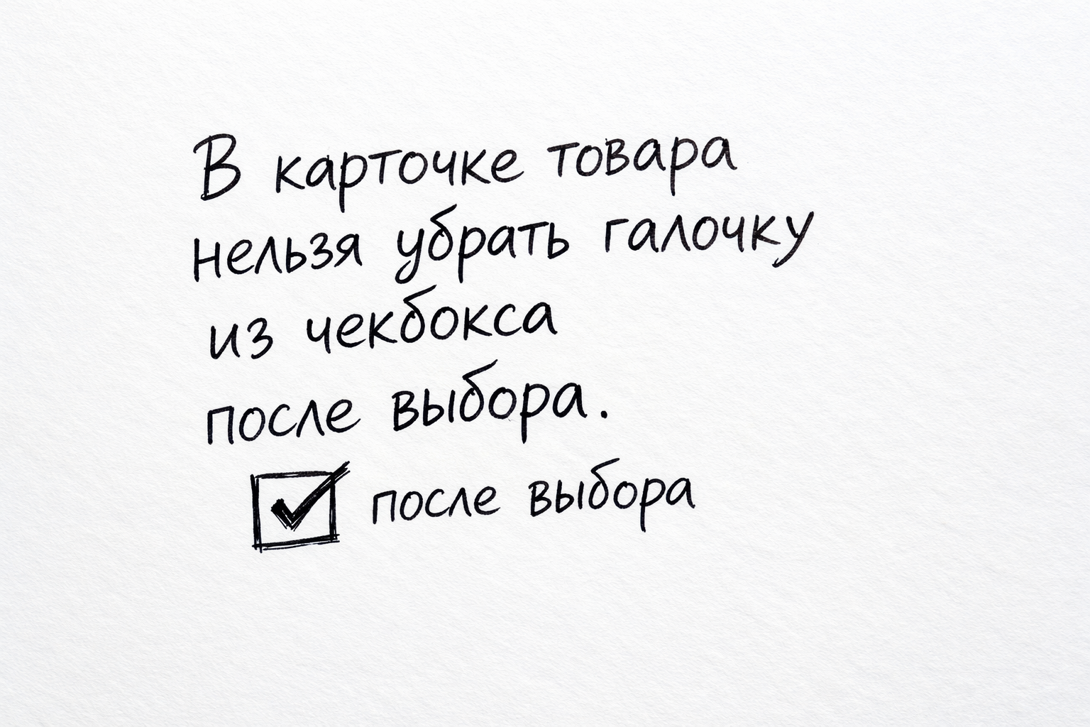 В карточке товара после выбора дополнительной опции чекбокс перестает работать как переключатель. Галочку снять нельзя: повторный клик не реагирует, метка неактивна, на мобильных попадание в цель осложнено. Пользователь теряет контроль над выбором.