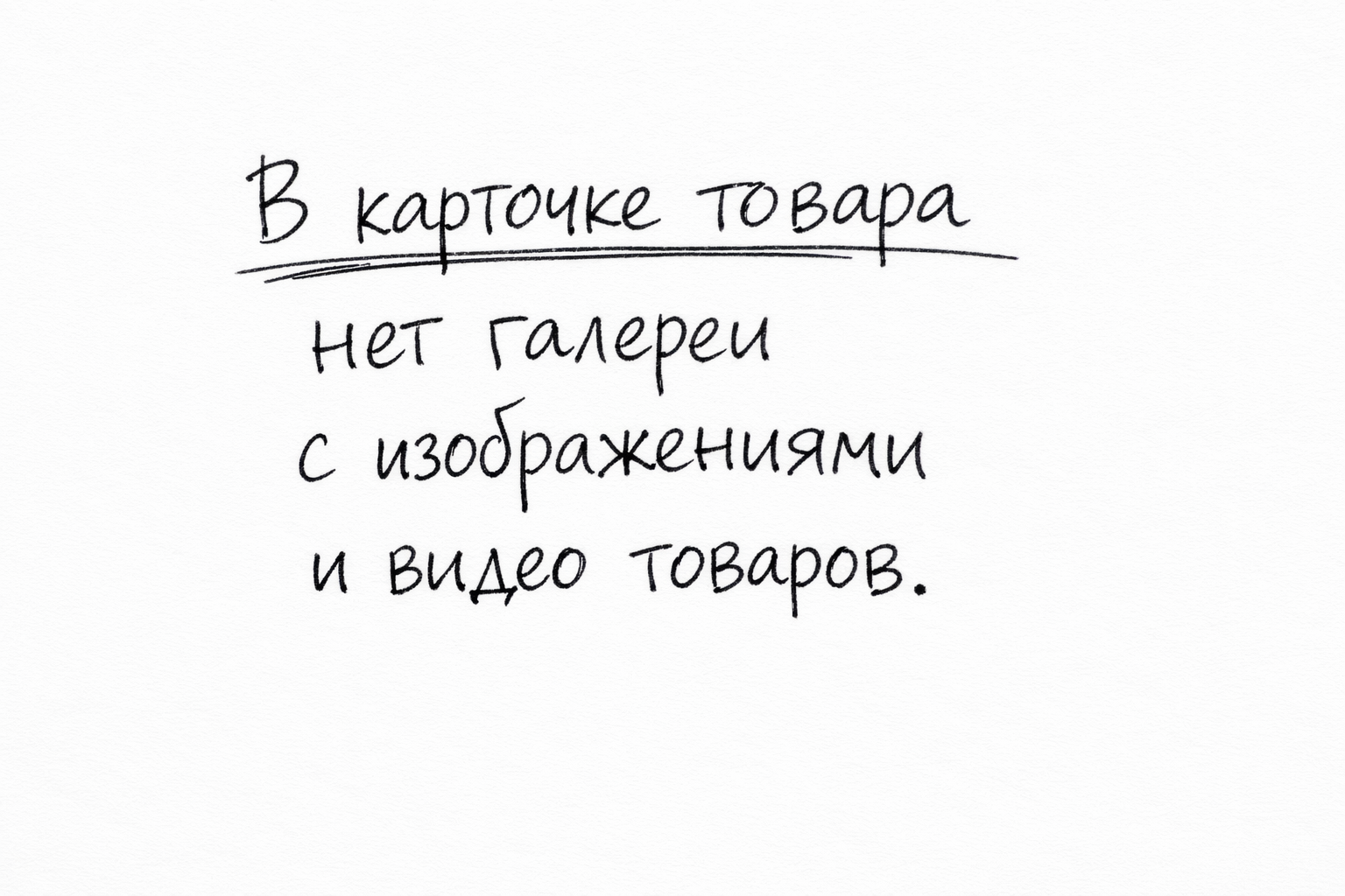 На мобильных свайп по фото не работает — нет привычного паттерна галереи. Кнопки «Купить» и цена остаются без поддержки визуальных доказательств. В обращениях в чат и звонках повторяются одни и те же вопросы, что указывает на нехватку визуального контента в карточке.