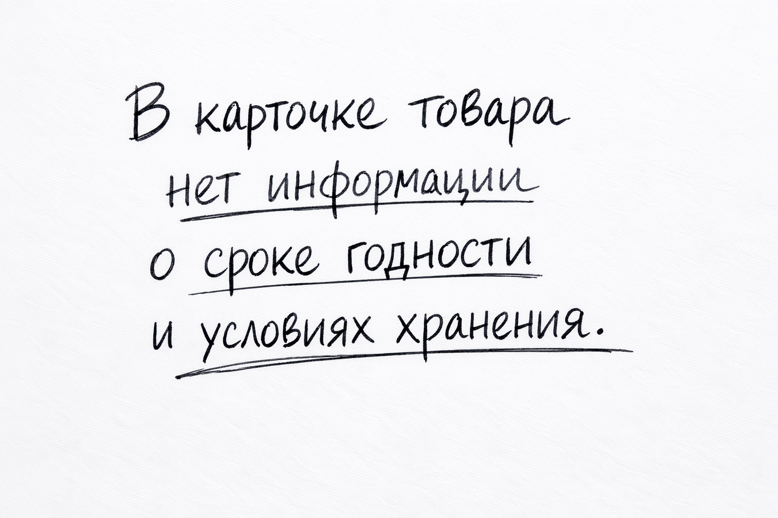 Покупатель видит цену и фото, но не понимает, сколько товар проживёт и как его хранить. На карточке нет срока годности и условий хранения. Возникают сомнения: продукт свежий ли, можно ли заказать впрок, выдержит ли доставку. Растёт риск возврата и отказа от покупки.